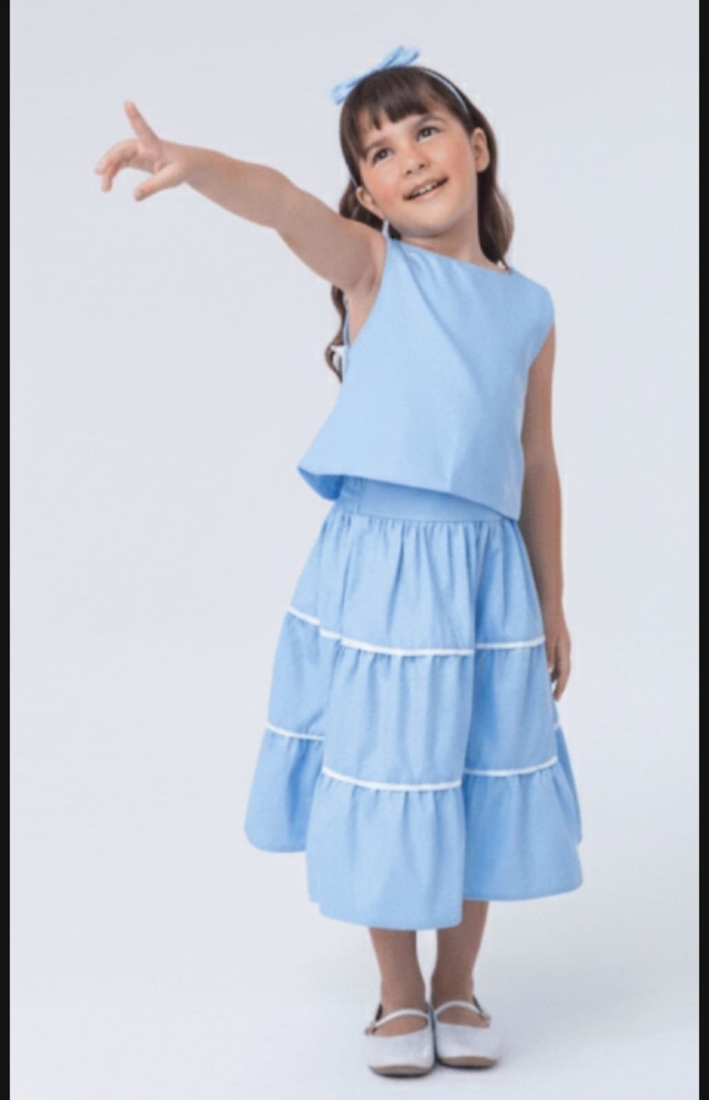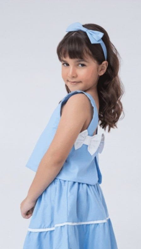 Conjunto de saia e blusa com detalhes que encantam. Saia longa rodada que as meninas amam e blusinha soltinha com lindos laços nas costas dando todo um charme para o look.
