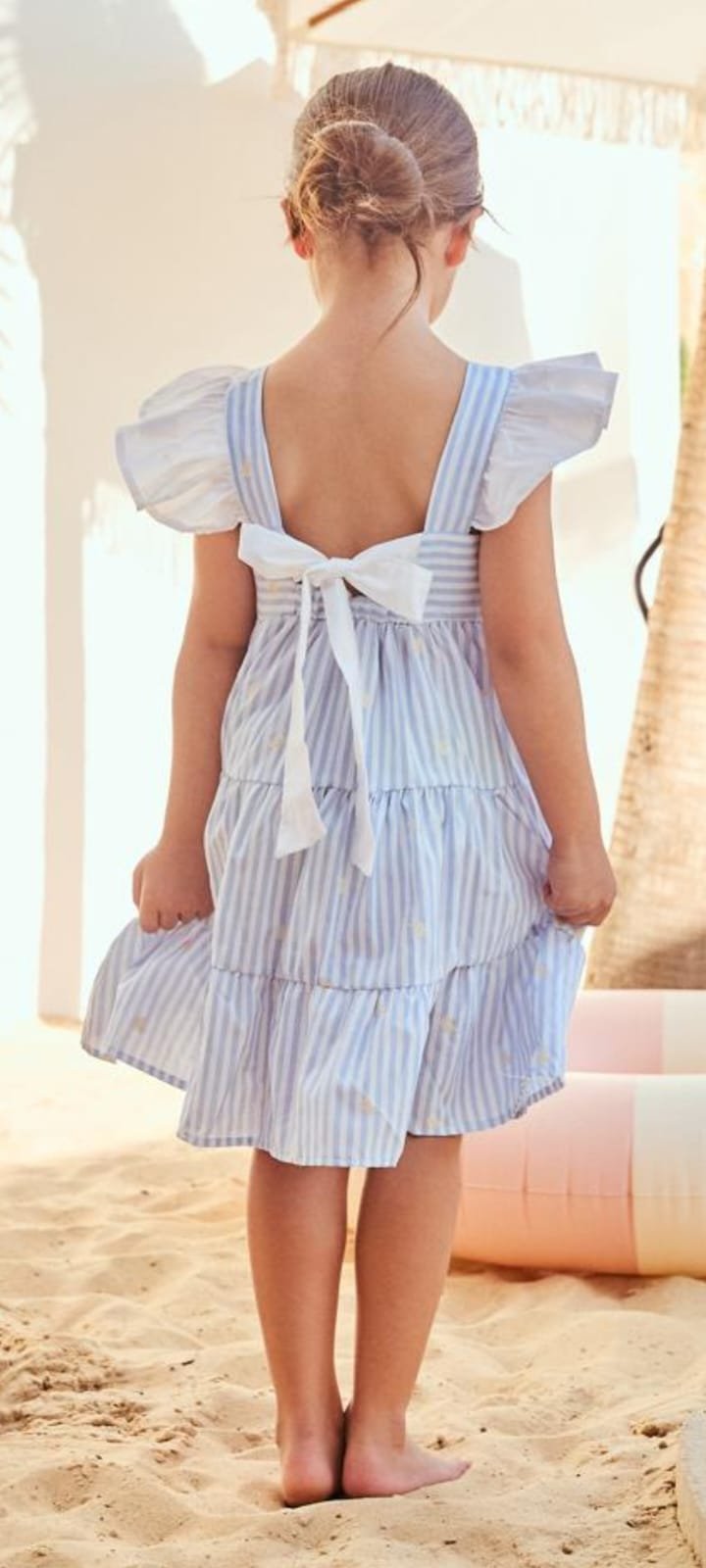 Com listras suaves e pequenas folhinhas bordadas, ele tem um design irresistível, babados para rodopiar, uma manguinha que é um charme um lindo laço gigante nas costas que o torna inesquecível.