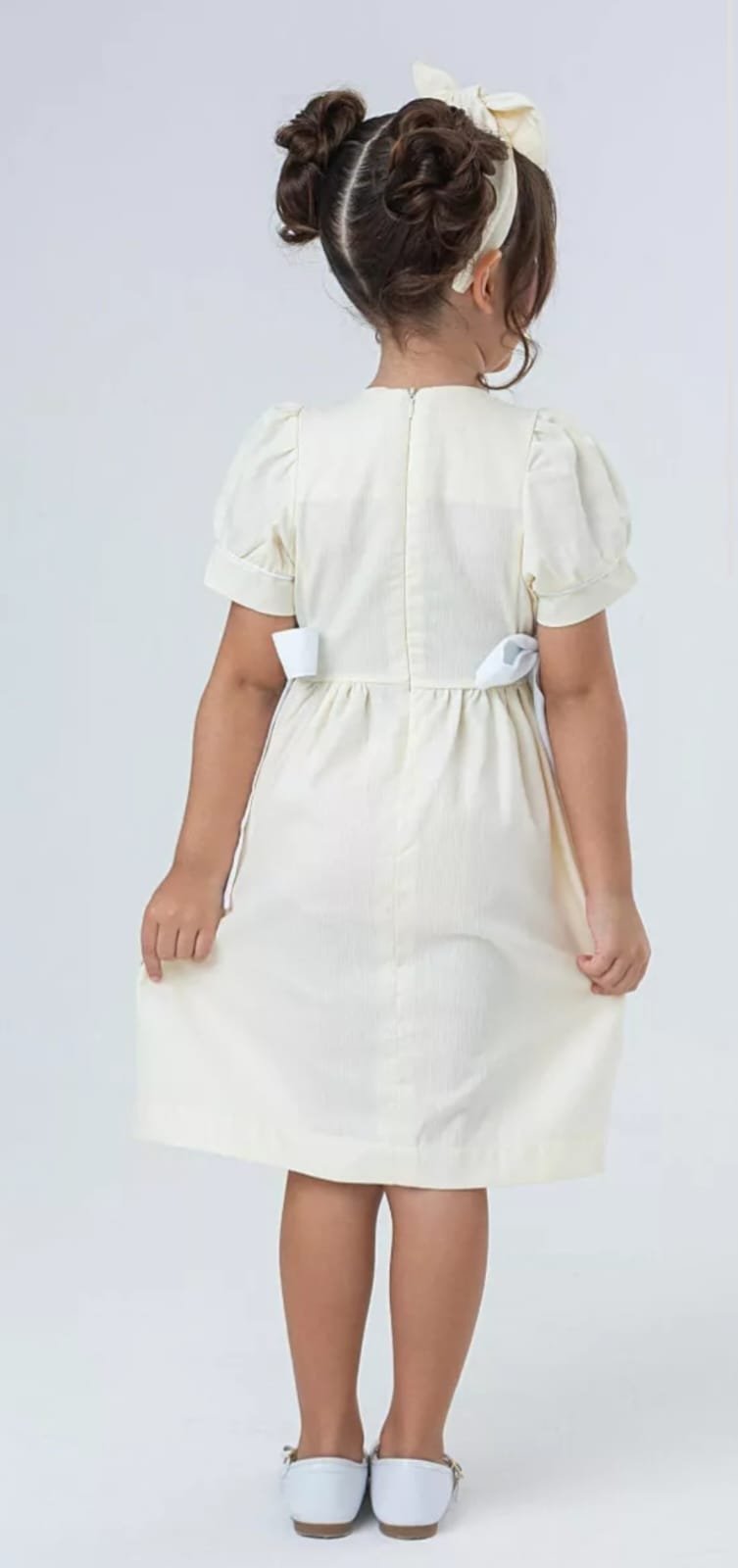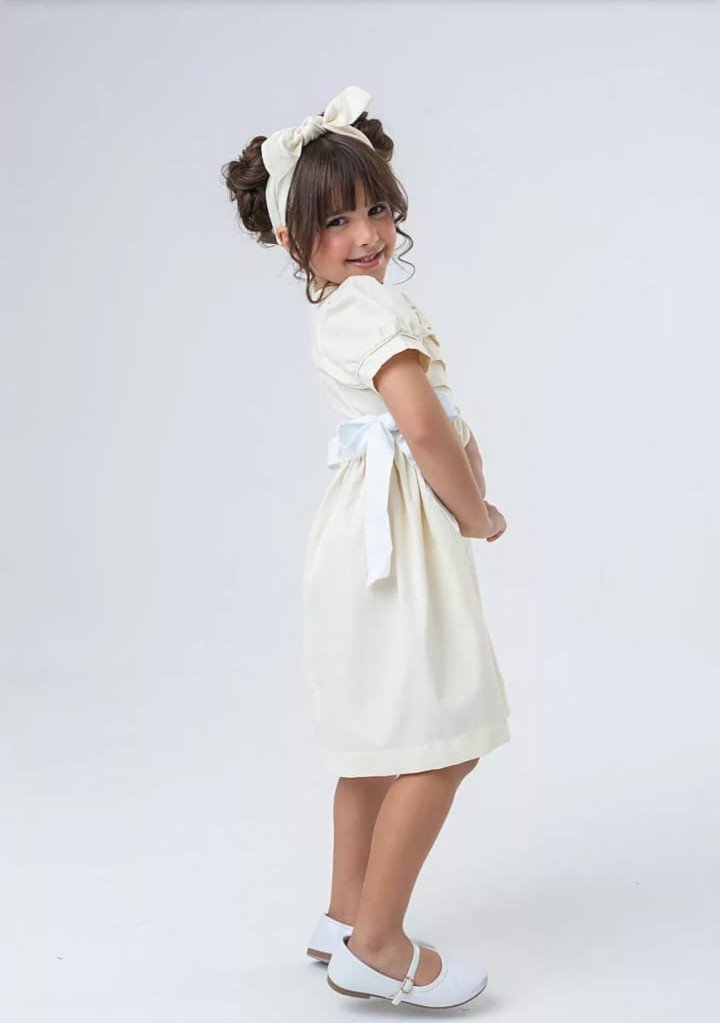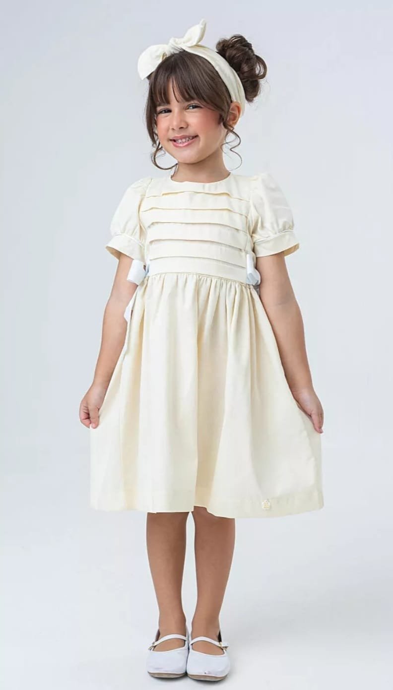 Tecido fustão, 100% algodão, garantindo conforto com um toque de poesia. A cor Offwhite realça a delicadeza do vestido. As mangas levemente bufantes completam o visual romântico e atemporal.