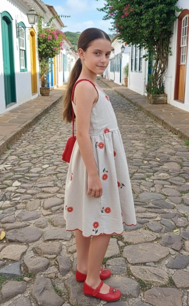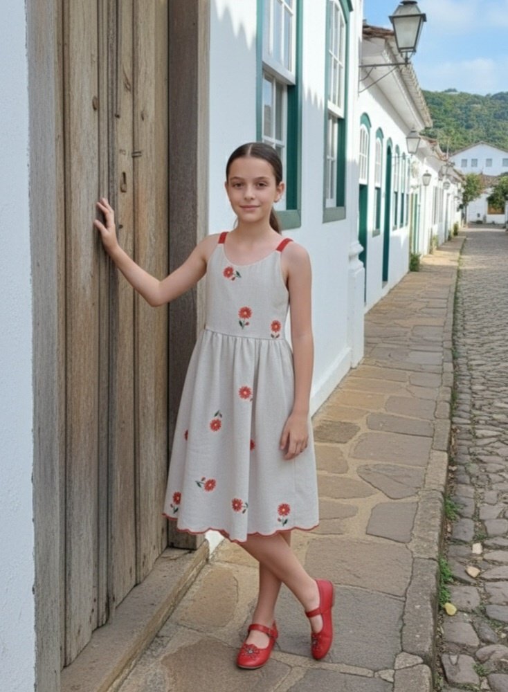 Este vestido em linho premium é um verdadeiro sonho bordado, unindo o frescor natural a flores delicadas que encantam à primeira vista. O acabamento em ondas e as alças vibrantes ganham um toque final irresistível com o lindo laço nas costas, garantindo um visual lúdico e sofisticado.